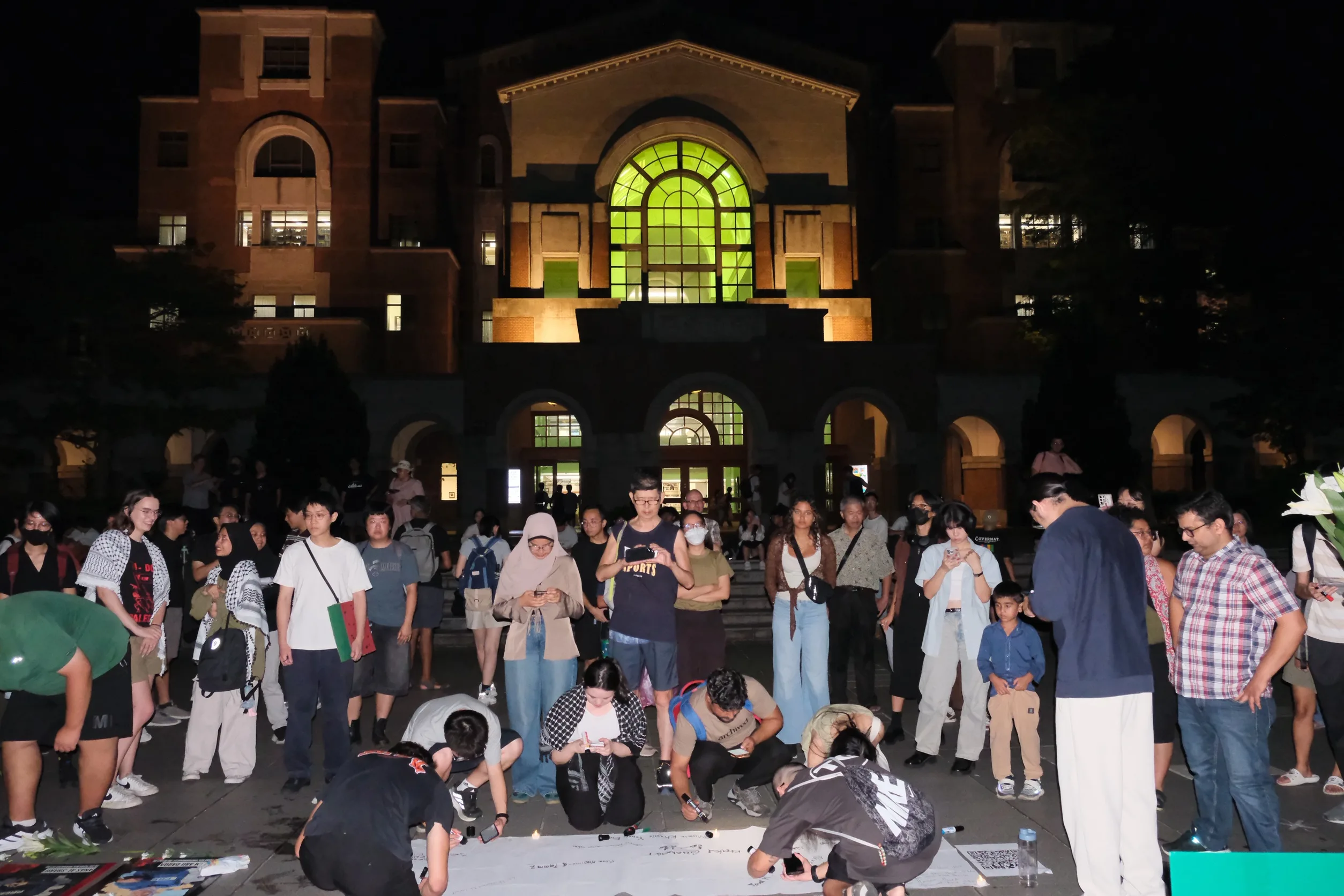 台灣時間九月十六日晚上七點在台大總圖前,成群黑影圍繞燭光,像一根根蠟燭的影子。