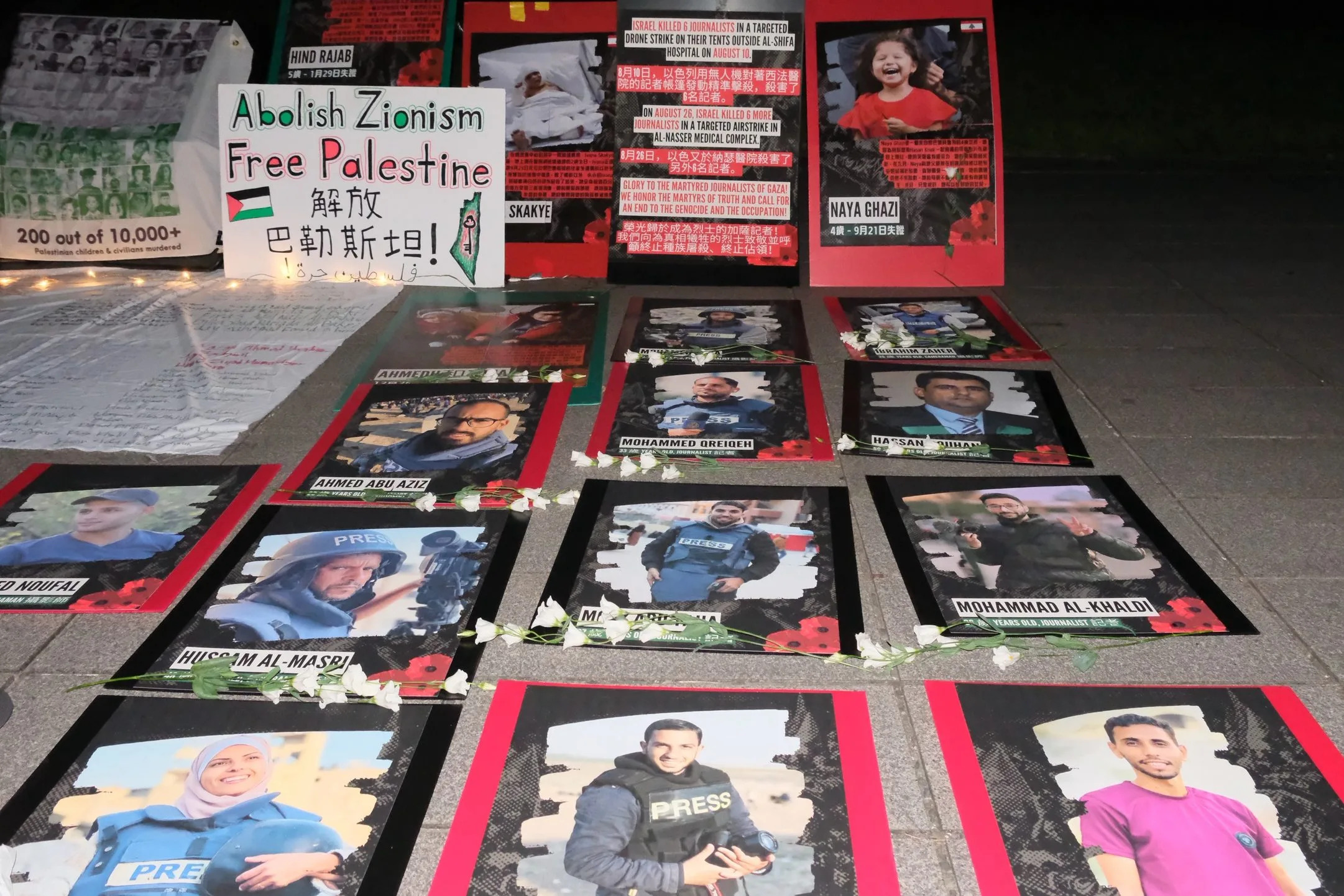 死於以色列派無人機射殺的記者遺像,現場參與者獻花弔唁( 影像/關之杰 )