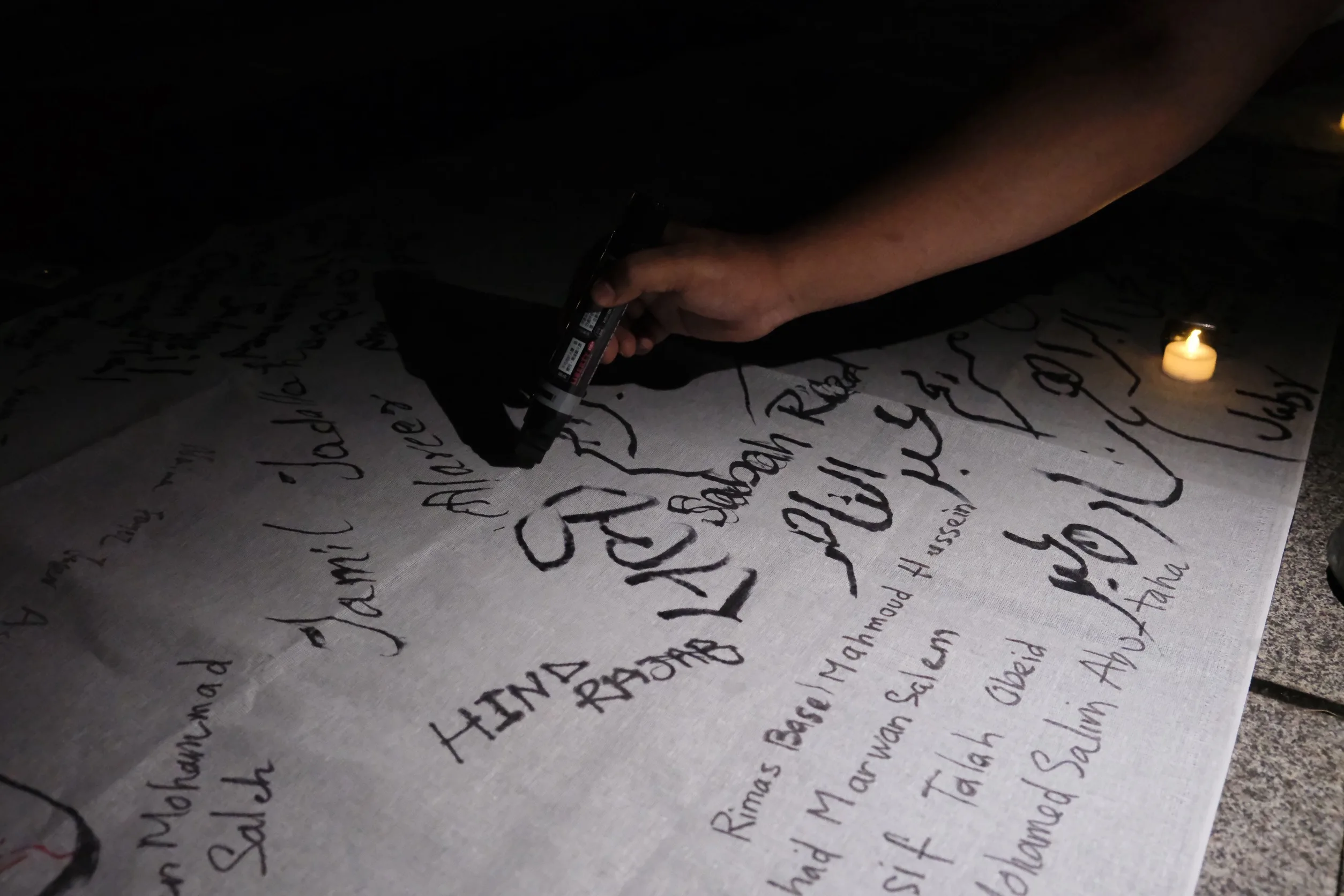 悼念會正式開始前,主辦方邀請各國參與者在布條寫下祝福語,弔唁以巴衝突中受難的巴勒斯坦人。( 影像/關之杰 )